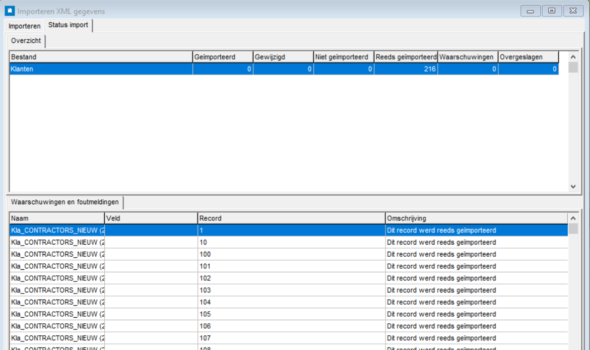 Als u het klantenbestand vervolgens opnieuw importeert in Expert/M krijgt u de melding dat de records reeds geïmporteerd werden.