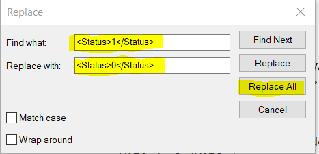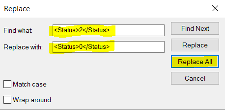 - Zoek de waarde <Status>1</Status> en vervang deze door <Status>0</Status> (Klik op de knop 'Alles vervangen'). Dit zorgt ervoor dat alle klantenrecords met de status 'Geïmporteerd' (= Status 1) terug de status 'Te importeren' (= Status 0) krijgen.