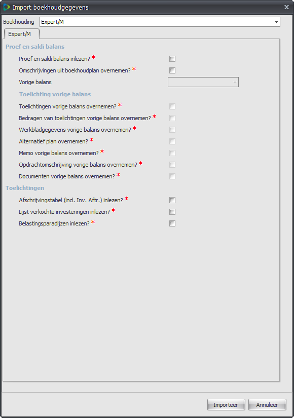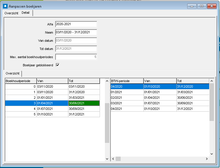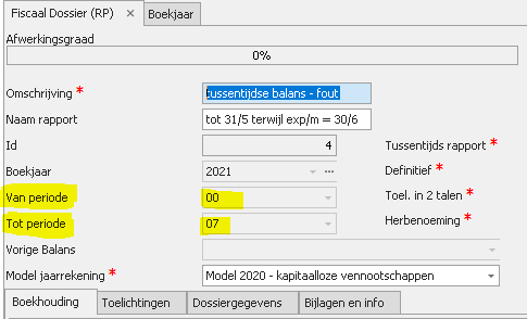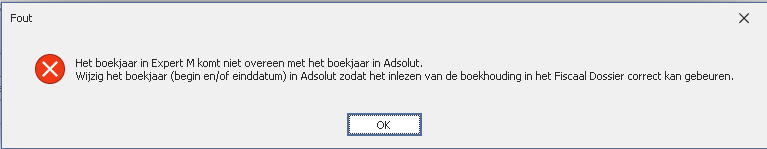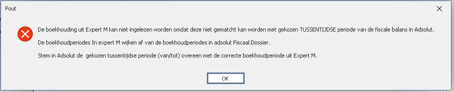 FAQ - Foutboodschappen als boekjaren/periodes niet overeenstemmenIndien het boekjaar of de boekhoudperiodes in Expert/M niet overeenkomen met het boekjaar en boekhoudperiodes in Fiscaal Dossier, dan kunnen er foutboodschappen komen. 1) Boekjaar Expert/M is verschillend van boekjaar in AdsolutIssue: De begin- en einddatum van het boekjaar in Expert/M moet overeenkomen met de begin- en einddatum in Adsolut. Indien dat niet het geval is, wordt onderstaande foutboodschap getoond.Oplossing: Wijzig de begin- en einddatum van het boekjaar in Adsolut en maak daarna een nieuwe fiscale balans op basis van het gewijzigde boekjaar in Adsolut. 2) Tussentijdse ingelezen balans: boekhoudperiodes in Expert/M verschillen van AdsolutBij het inlezen van een TUSSENTIJDSE balans in Fiscaal Dossier kan het in zeer specifiek geval voorkomen dat het inlezen van een balans niet mogelijk is. Een tussentijdse balans betekent dat in Fiscaal Dossier gekozen wordt om de boekhouding NIET voor het gehele boekjaar in te lezen.Voorbeeld: boekjaar 3/11/2020 – 31/12/2021 Adsolut Fiscaal Dossier inlezen boekhouding tot periode = 07 (31/5/2021) In deze situatie moet er gekeken worden dat OOK de matching tussen Adsolut en Expert M boekhoudperiodes mogelijk is. Indien de matching van de gekozen periode niet mogelijk is, komt er een boodschap. Voorbeeld: