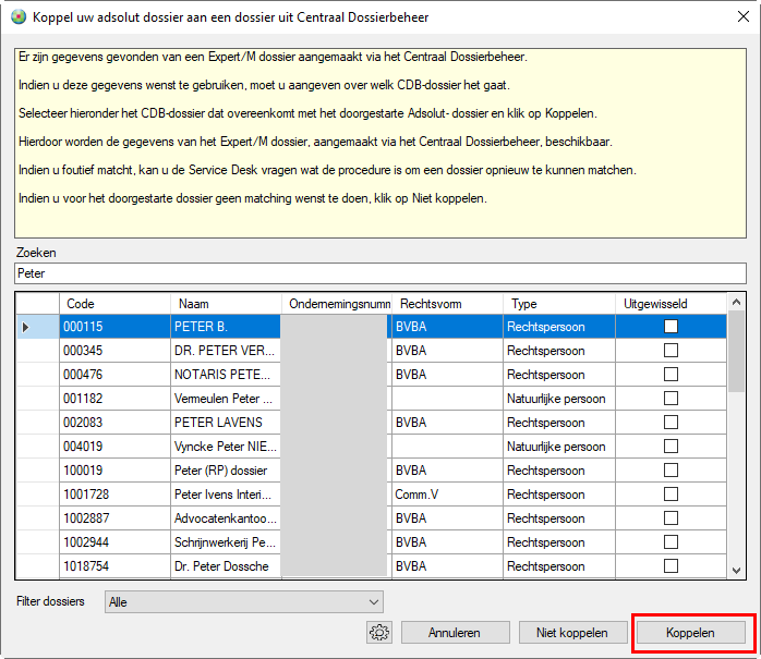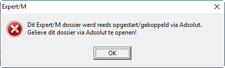 Per dossier zal bij de eerste doorstart (eenmalig) een koppeling gelegd worden met de data van Expert/M uit Centraal dossierbeheer. Dit betekent dat de relatie uit Adsolut moet worden "gematcht" met de relatie uit Centraal dossierbeheer. Hierdoor wordt eerst een back-up gemaakt van de Expert/M database en vervolgens de volledige database van het geselecteerde Expert/M-dossier verplaatst naar de Kluwerdata-structuur onder Adsolut. Vanaf dat moment zal het betreffende Expert/M dossier enkel via Adsolut opgestart kunnen worden en dus niet meer via Centraal dossierbeheer. Indien u toch probeert om dit dossier te openen via Centraal dossierbeheer dan krijgt u volgende boodschap: