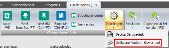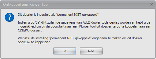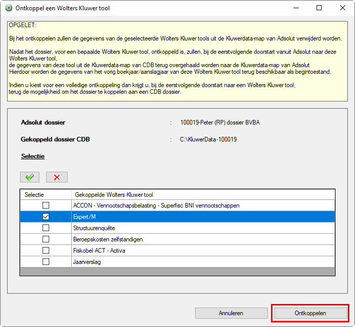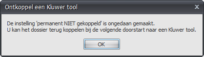 5. Een gekoppeld Expert/M dossier ontkoppelenIndien, bij de eerste doorstart van een dossier vanuit de Fiscale balans naar Expert/M, het dossier gekoppeld is aan een dossier uit Centraal dossierbeheer, kan, om bepaalde redenen (bijv.. Gekoppeld aan een verkeerd dossier), dit dossier terug ontkoppeld worden. Dit kan via de knop Instellingen – Ontkoppel Wolters Kluwer-tool. U komt in het volgende scherm terecht: Hier krijgt u een overzicht van de Wolters Kluwer-tools die gekoppeld zijn aan het Adsolut dossier. U vinkt Expert/M of meerdere gekoppelde Wolters Kluwer tools aan en klikt vervolgens op de knop Ontkoppelen. Bij het ontkoppelen zal steeds een back-up worden genomen van de data in de kluwerdata-map van Adsolut. Voor Expert/M zal de data ook terug verplaatst worden naar de kluwerdata-map van Centraal dossierbeheer waarna u het Expert/M dossier ook terug kan openen via Centraal dossierbeheer. 6. Een “permanent NIET gekoppeld dossier” ontkoppelenIndien, bij de doorstart naar Expert/M, gekozen is voor “Niet koppelen” dan is het dossier ingesteld als “permanent NIET gekoppeld”. Deze instelling kan ongedaan gemaakt worden via de knop Instellingen – Ontkoppel Wolters Kluwer-tool. U komt in het volgende scherm terecht: Nadat op de knop Ja is geklikt wordt de instelling ongedaan gemaakt en komt u in het volgende scherm terecht. Wanneer u op de knop OK hebt geklikt, hebt u terug de mogelijkheid om, bij de doorstart naar Expert/M (of een andere Kluwer-tool) dit dossier alsnog te koppelen aan een dossier uit Centraal dossierbeheer. |