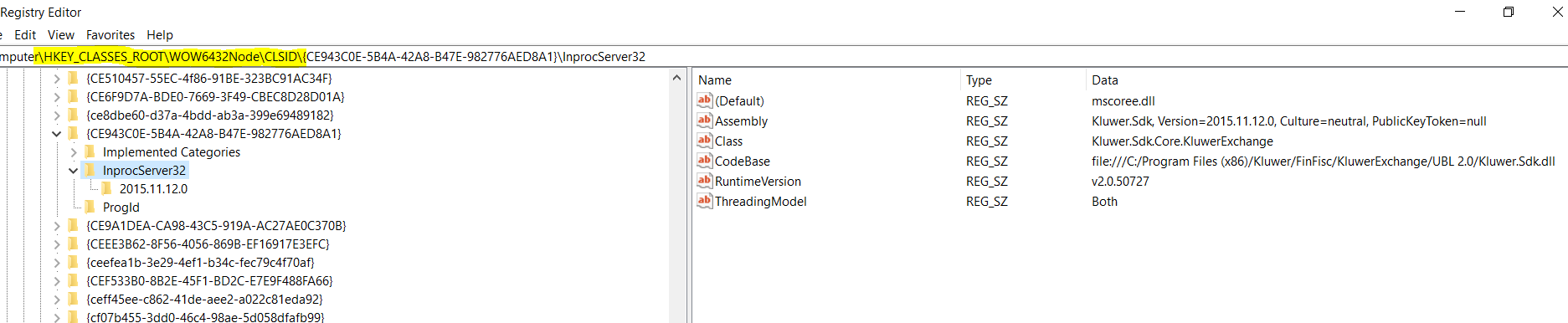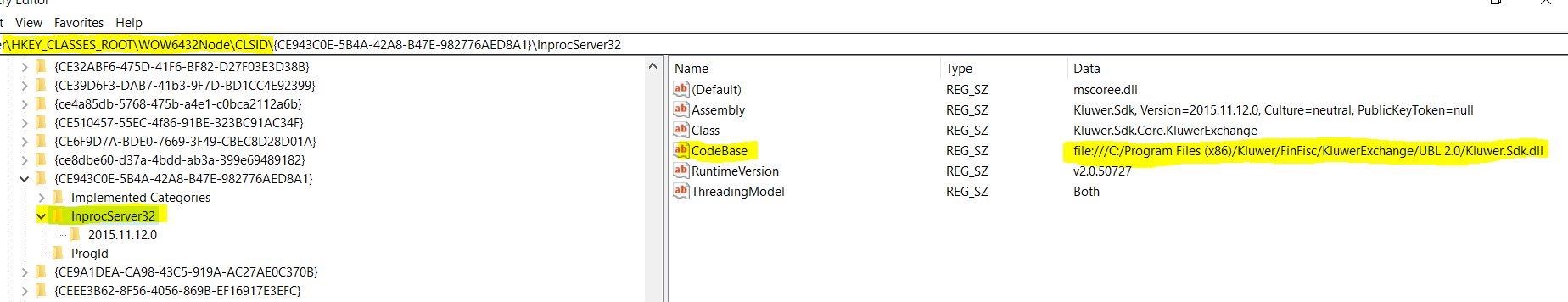 c:\Windows\Microsoft.NET\Framework\v2.0.50727>regasm /codebase uit te voeren op het bestand 'wkb.processinvoice.connectubl.dll' uit de folder '?:\Kluwer\Finfisc\KluwerExchange\UBL2.0\' (Het vraagteken moet vervangen worden door de effectieve locatie waarin deze folder terug te vinden is. In onderstaand voorbeeld is dit 'C:\Program Files (x86)\')