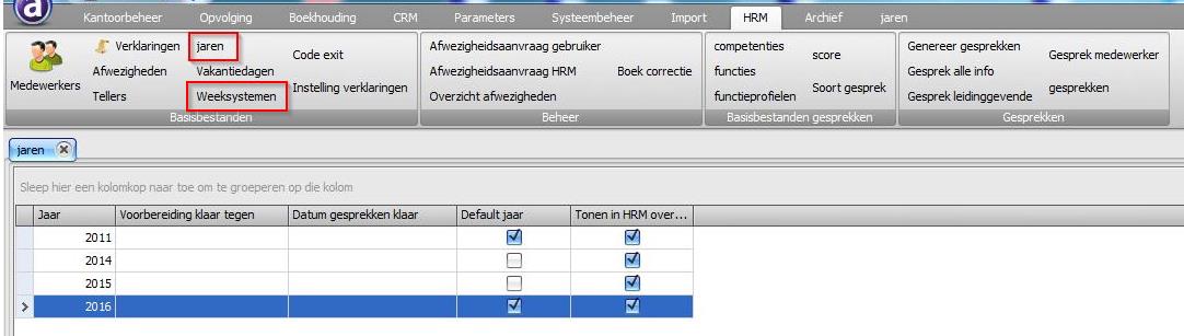Je boekt dan bij de weeksystemen een beginsaldi in voor het jaar in kwestie ("geboekt" niet aanvinken, "is beginsaldo" aanvinken)