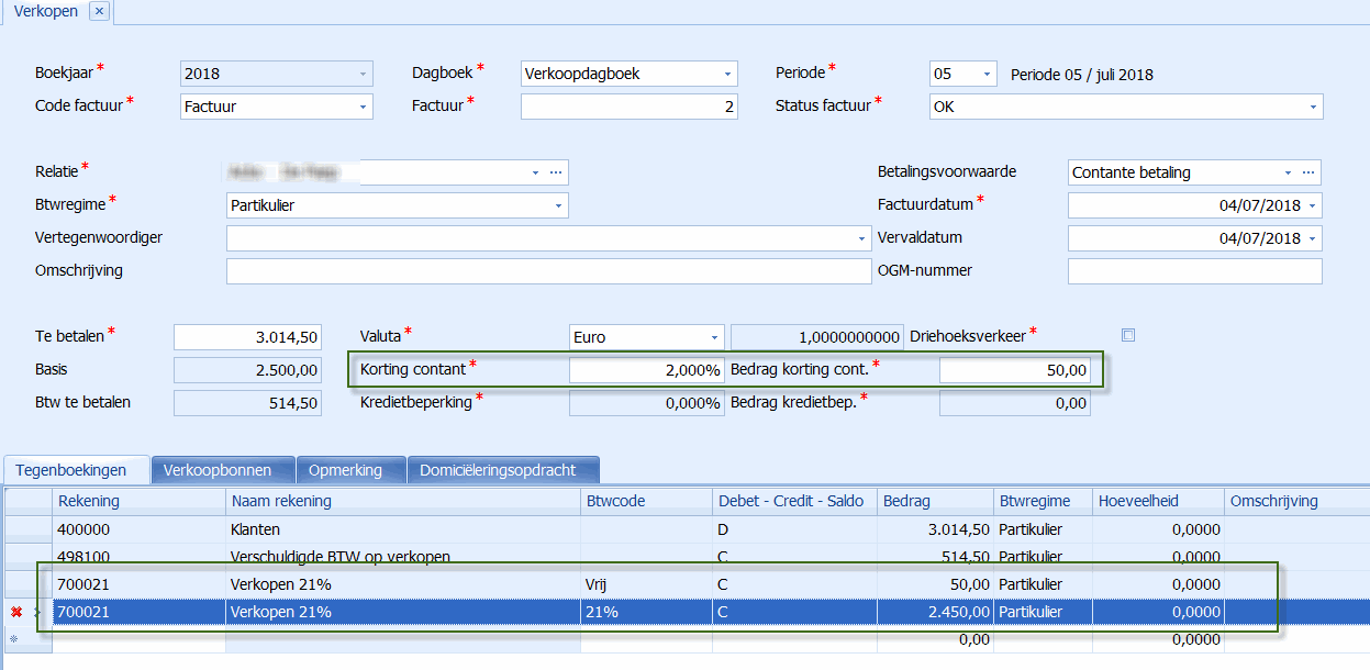 U wil een verkoopfactuur inboeken in Adsolut met korting bij contante betaling.