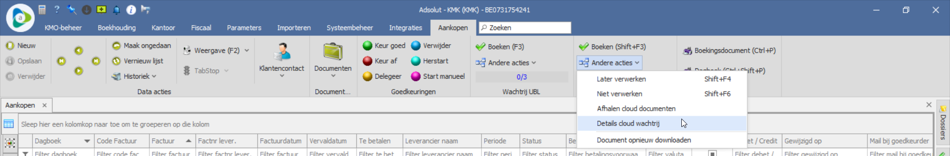 Je verwijdert facturen uit de cloud wachtrij via het aankopenscherm. Kies in het menu voor Andere acties > Details cloud wachtrij.