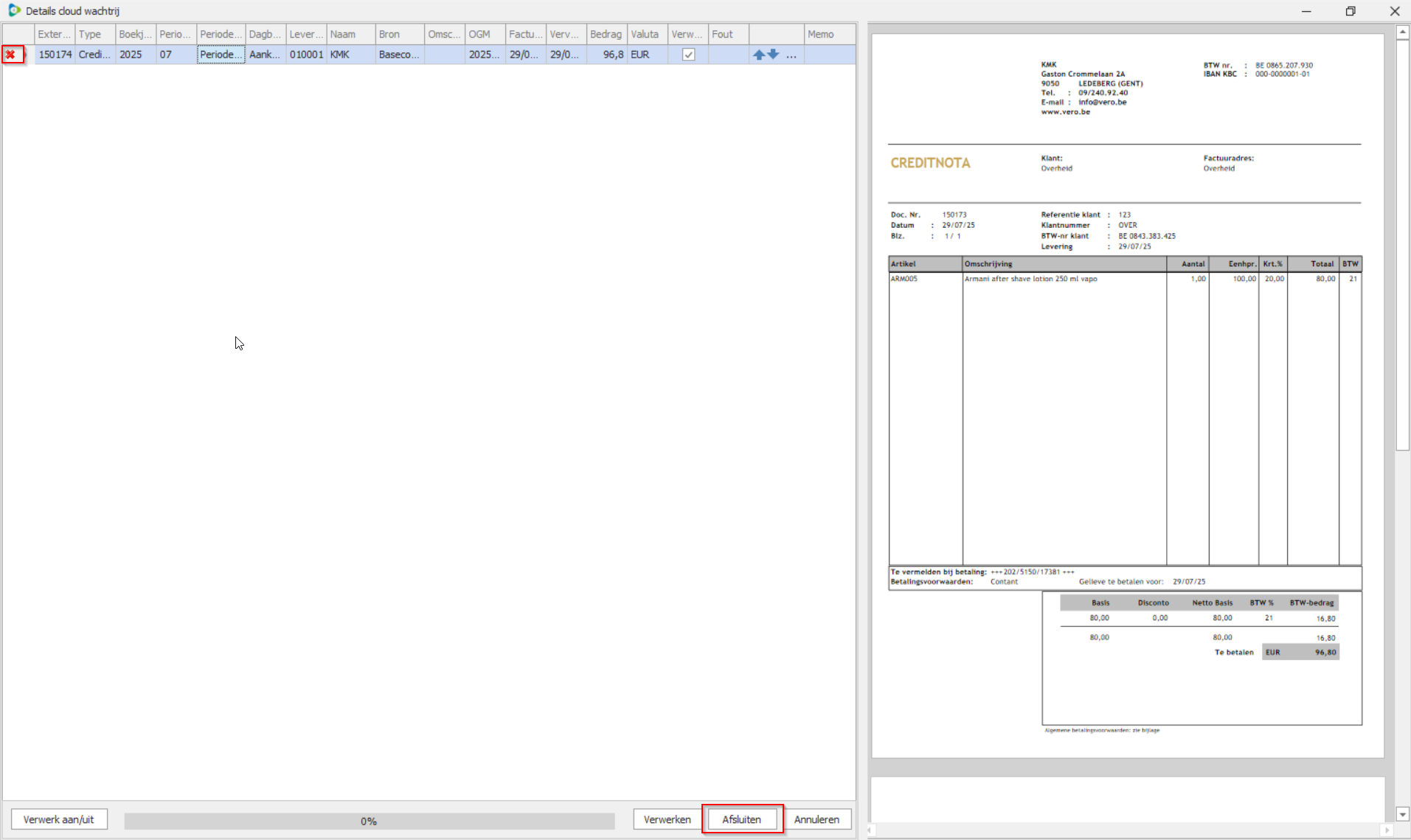 Klik op het rode kruisje naast de factuur die je wilt verwijderen. Sluit daarna af met Afsluiten.