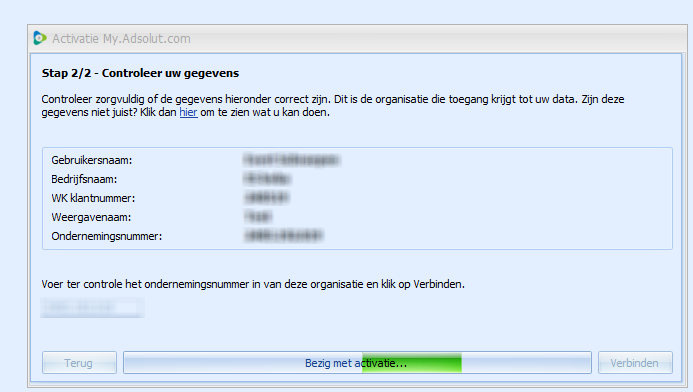 Klik op Verder. Vul vervolgens in het bevestigingsscherm onderaan je ondernemingsnummer in om te controleren of My.Adsolut.com de juiste onderneming activeert. We controleren je ondernemingsnummer. Zodra dat succesvol is, klik je op Verbinden.