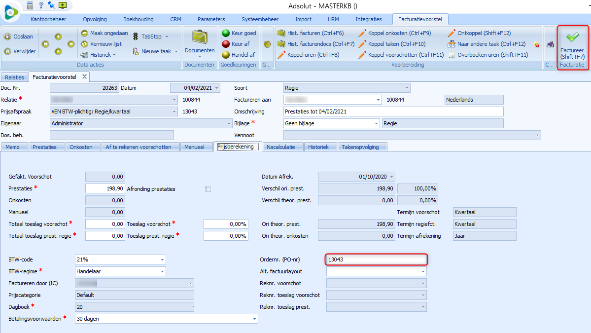 Als u nu deze relatie een facturatievoorstel opmaakt, wordt het order- of PO-nummer ingevuld op het de tabblad Prijsberekening.