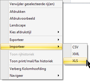 - Klik met de rechtermuisknop op een lege lijn en selecteer Importeer, XLS.