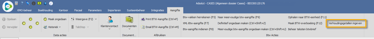 In het Dossier > Boekhouding > BTW > Aangifte > Verhoudingsgetallen ingeven