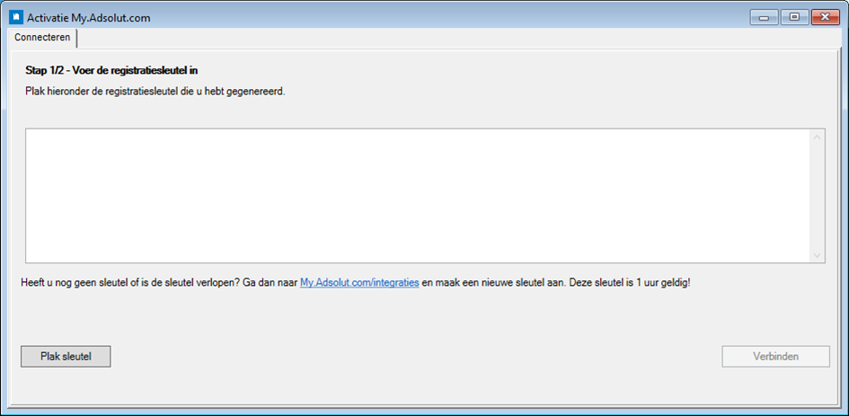 Let op, in deze stap hebt u een registratiesleutel nodig. Als u die nog niet heeft, klik dan op Registratiesleutel aanmaken om hem op My.Adsolut.com op te halen.
