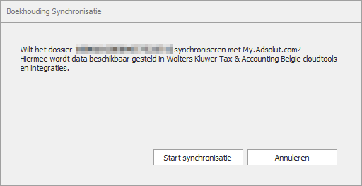- Dossier synchronisatie wordt opgestart. Bevestig voor akkoord door het hokje aan te vinken en klik rechts op de knop Start synchronisatie.