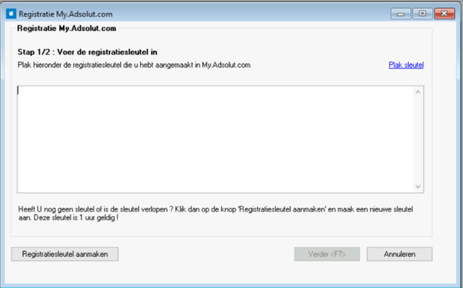 Plak hier de registratiesleutel die u op My.Adsolut.com hebt gemaakt door te klikken op de link Plak sleutel.