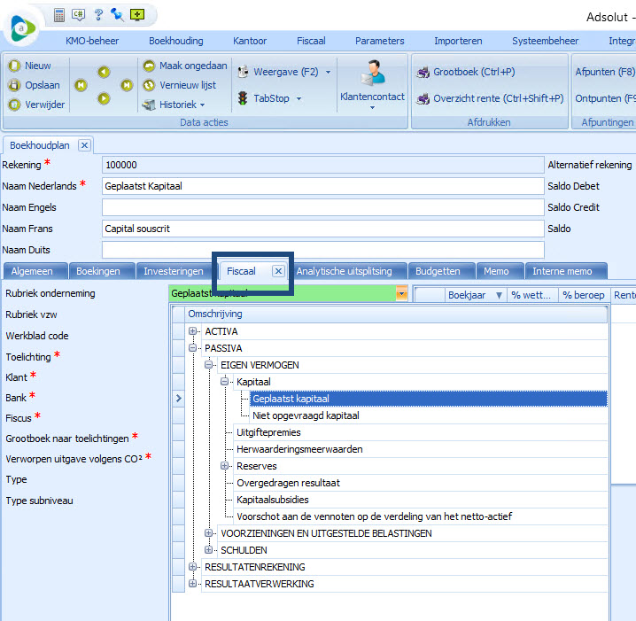 Hetzelfde principe gebruiken we binnen de werking van het boekhoudplan onder de tab Fiscaal.