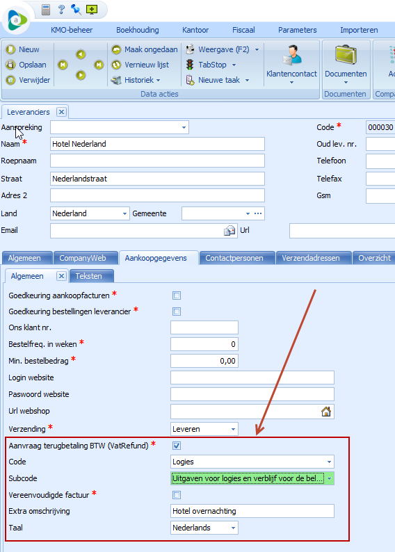 Ga in het subdossier > Boekhouding > Leverancier > duidt leverancier aan waarbij vatrefund mogelijk is.