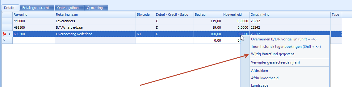 Als u nadien de VAT refund-gegevens nog wenst te wijzigen, klikt u rechts op de boekingslijn die VAT-refund gegevens bevat en kiest u voor 'Wijzigen VAT refund-gegevens'. De pop up wordt dan opnieuw getoond.