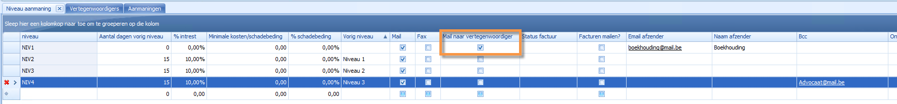 Per niveau kan ingesteld worden of de vertegenwoordiger een kopie van de aanmaning moet gemaild krijgen. (De vertegenwoordiger zal de mail in BCC ontvangen, zodat de klant dit niet ziet) Het veld ‘Mail naar vertegenwoordiger’, kan u via de veldkiezer toevoegen. Dit kan afzonderlijk ingesteld worden van het BCC veld. In dit BCC veld kan een vast emailadres ingegeven worden. In onderstaand voorbeeld, zal de advokaat voor niveau 4 eveneens een mail ontvangen. Zorg ervoor dat het vinkje in de kolom ‘email’ aan staat.