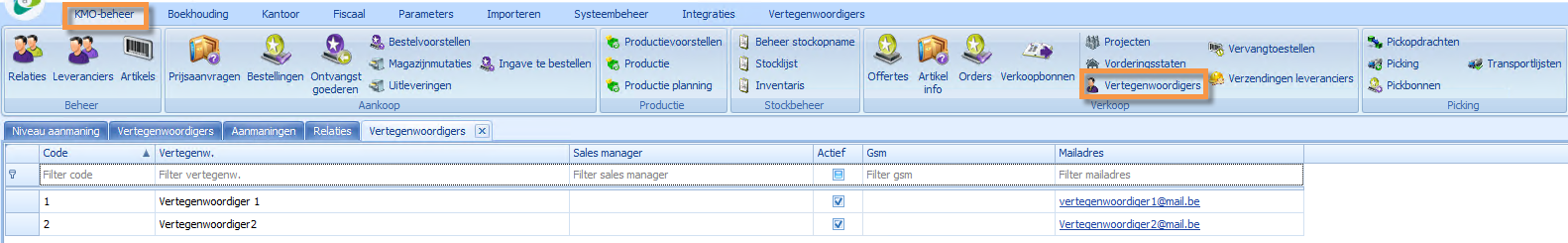 Wanneer u een kopie van de aanmaning naar de vertegenwoordiger van die relatie wenst te mailen, dient uiteraard een vertegenwoordiger gekoppeld te zijn aan de relatie. De vertegenwoordigers zelf, kan u ingeven via het menu ‘KMO-Beheer’ – ‘Verkoop’ – ‘Vertegenwoordigers’