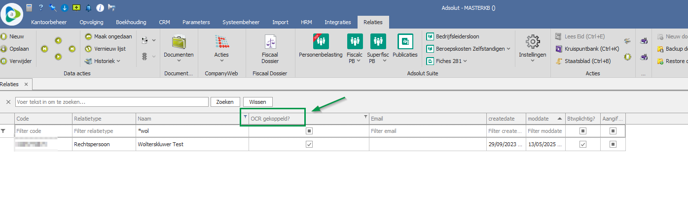 - Kijk via Kantoorbeheer (1) bij de Relatiefiche (2) onder de tab Software (3). Als daar Adsolut OCR Aankoop en/of Verkoop staat, is de OCR actief.