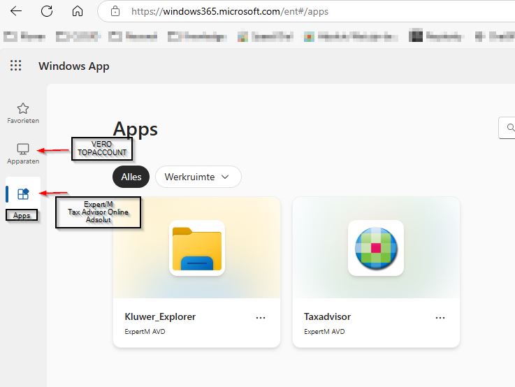 - Gebruik de applicatie: na inloggen vind je je applicaties onder "Apparaten" voor desktopapplicaties zoals Topaccount en Vero, en onder "Apps" voor applicaties die direct in de browser starten, zoals Expert/M, Tax Advisor en Adsolut.