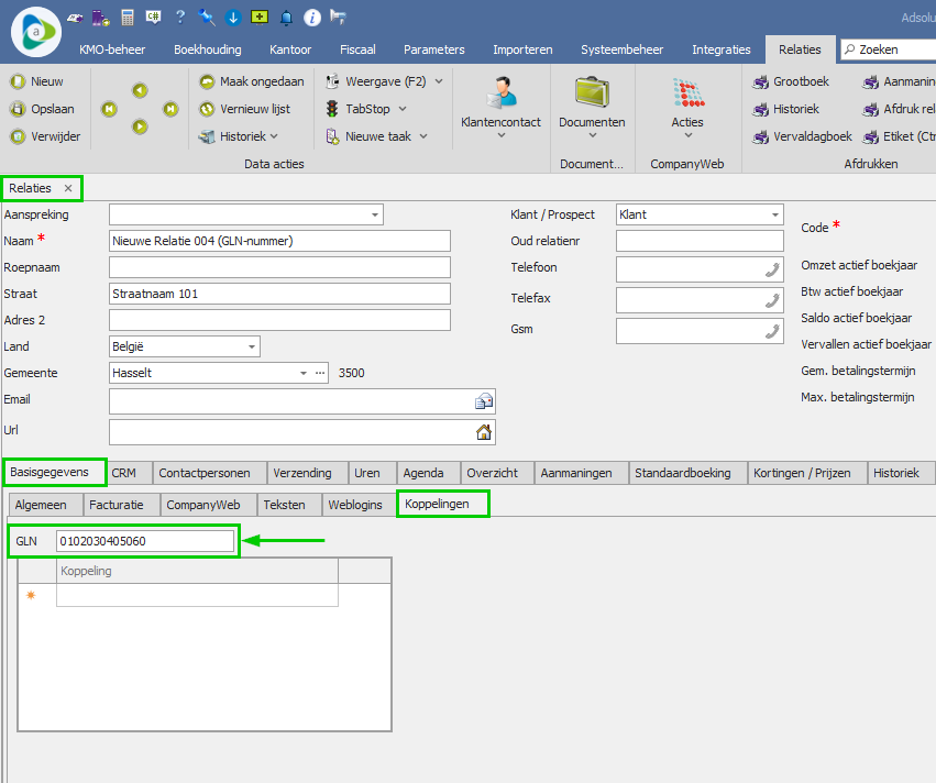 Vul in de relatiefiche van de betreffende relatie het GLN-nummer in op het tabblad Basisgegevens > Koppelingen.