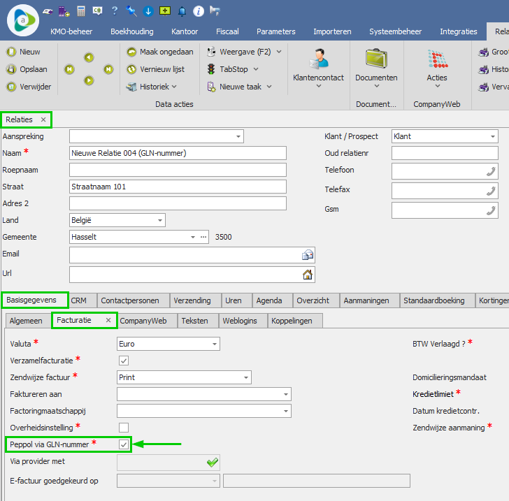 Daarna kun je het vinkje Peppol via GLN aanduiden op het tabblad Basisgegevens > Facturatie.