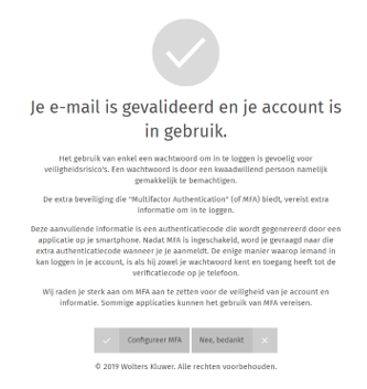 De activatie van Multi-Factor Authenticatie is een optionele laatste stap tijdens de creatie van een Wolters Kluwer TAA Software Account. Nadat je het registratieformulier hebt ingevuld om een account te maken, ontvang je een activatiemail. Klik de link in deze e-mail aan om de activatie van je account te finaliseren. Wanneer je op deze link klikt, is het Wolters Kluwer TAA Software Account gebruiksklaar.