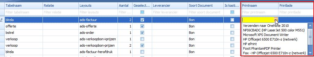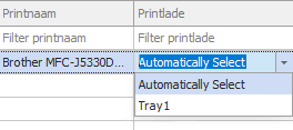- Stel (rechts in diezelfde rij) de printer (‘printnaam’) en printlade in m.b.v. de dropdown-menu’s. Deze instellingen zullen worden opgehaald door te communiceren met de printer m.b.v. de hiervoor ingestelde stuurprogramma’s