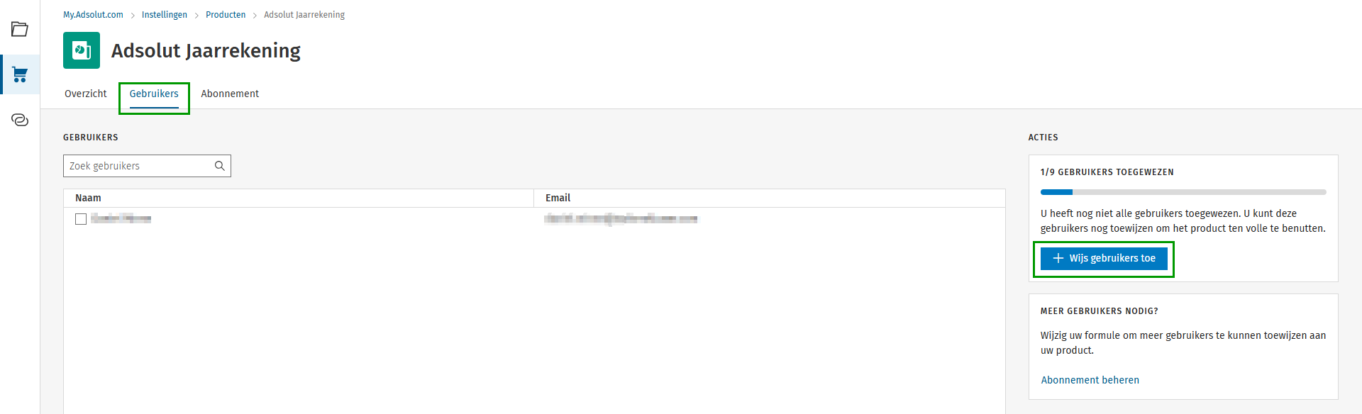 - Via het tabblad Gebruikers kun je gebruikers toevoegen door te klikken op Wijs gebruikers toe.