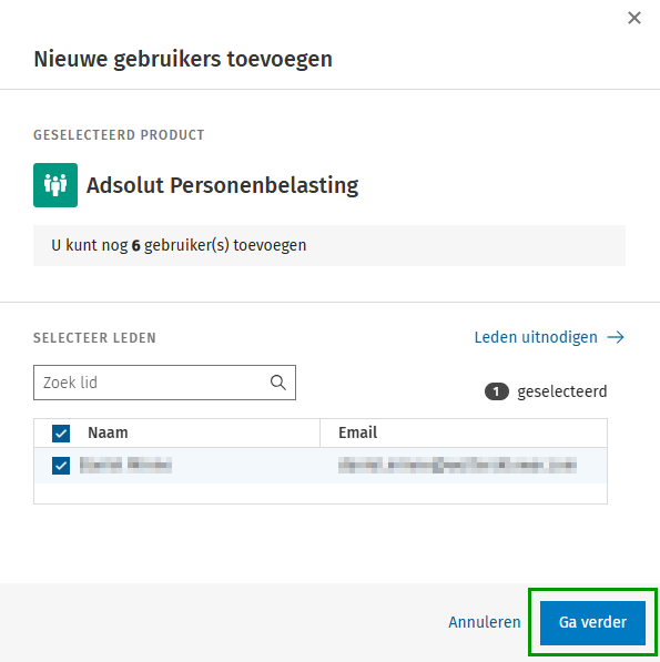 Je selecteert de gebruiker en klikt onderaan op Ga verder.