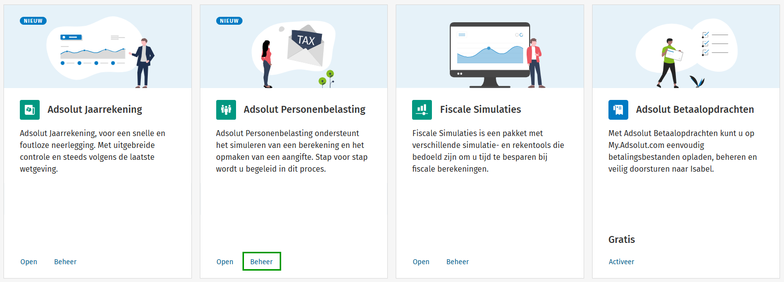 Op de tegel van Adsolut Personenbelasting klik je op Beheer