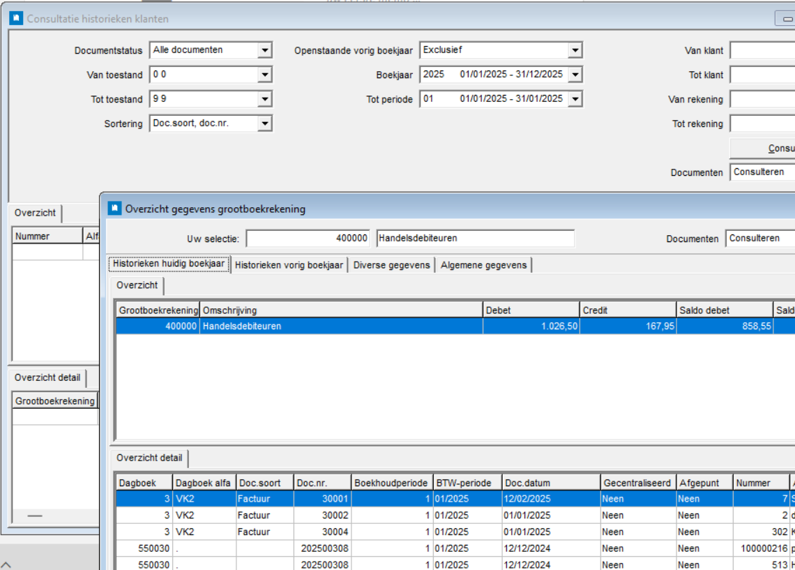 - Via het menu Consultatie > Historieken > Klanten / Leveranciers kan je snel de historieken per boekjaar van klanten/leveranciers raadplegen.