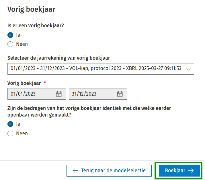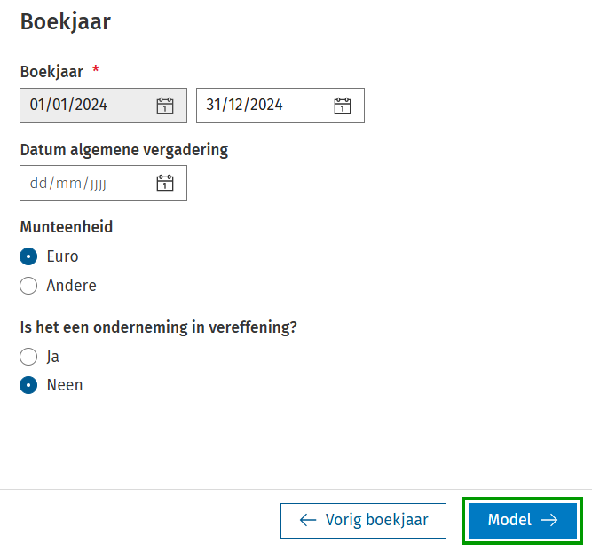 Ter info Het model voor een geconsolideerde jaarrekening en voor verenigingen/stichtingen zijn beschikbaar via aparte modules. Contacteer je accountmanager voor meer informatie over deze modules. 3. Indien er een vorig boekjaar bestaat voor dit dossier, dan herkent Adsolut Jaarrekening dit en wordt het hier voorgesteld. Is er geen vorig boekjaar, selecteer je Neen. Vervolgens klik je op de knop Boekjaar. 4. In dit scherm kun je details van het huidige boekjaar vervolledigen. Klik nadien op de knop Model.