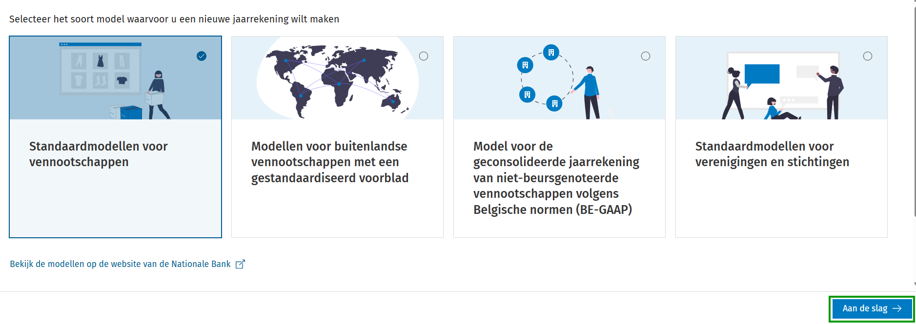 2. Selecteer het model van de jaarrekening en klik onderaan rechts op de knop Aan de slag.