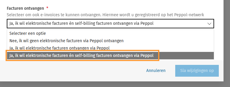 Vervolgens kun je onderaan kiezen om Self-Billing facturen te ontvangen via het Peppol-netwerk.