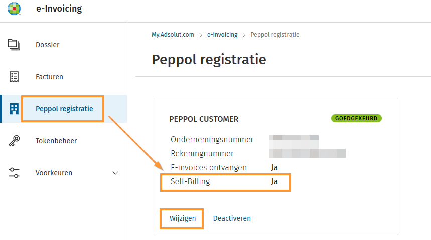 Activatie Je logt in op het e-invoicingportaal en gaat naar 'Peppol registratie'. In de registratiemodule kun je een vinkje vinden voor 'Self-Billing'. Je kunt deze activeren via de knop 'Wijzigen'.