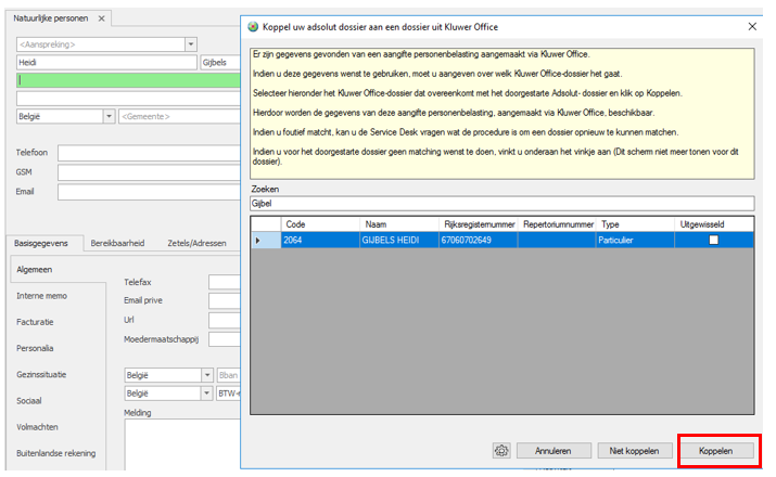 2) Eerste keer werken met Personenbelasting onder AdsolutPer dossier zal bij de eerste doorstart (eenmalig) een koppeling gelegd worden met de data uit Centraal dossierbeheer. Dit betekent dat u de natuurlijk persoon uit Adsolut moet "matchen" met de natuurlijke persoon uit Centraal dossierbeheer. Het volgende scherm zorgt hiervoor: