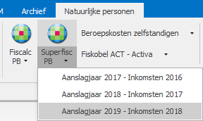 - Klik op de Knop "Fiscalc PB" of "Superfisc PB" en selecteer het juiste aanslagjaar.
