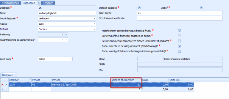 Dubbelklik op het betreffende dagboek waarin de verkoopfacturen worden geboekt en zet het 'volgend stuknummer' terug juist. D.w.z. het laatst ingeboekte stuk + 1. In dit voorbeeld is de laatst geboekte verkoopfactuur 20. Daarom plaatsen we hier bij volgend stuknummer: 21