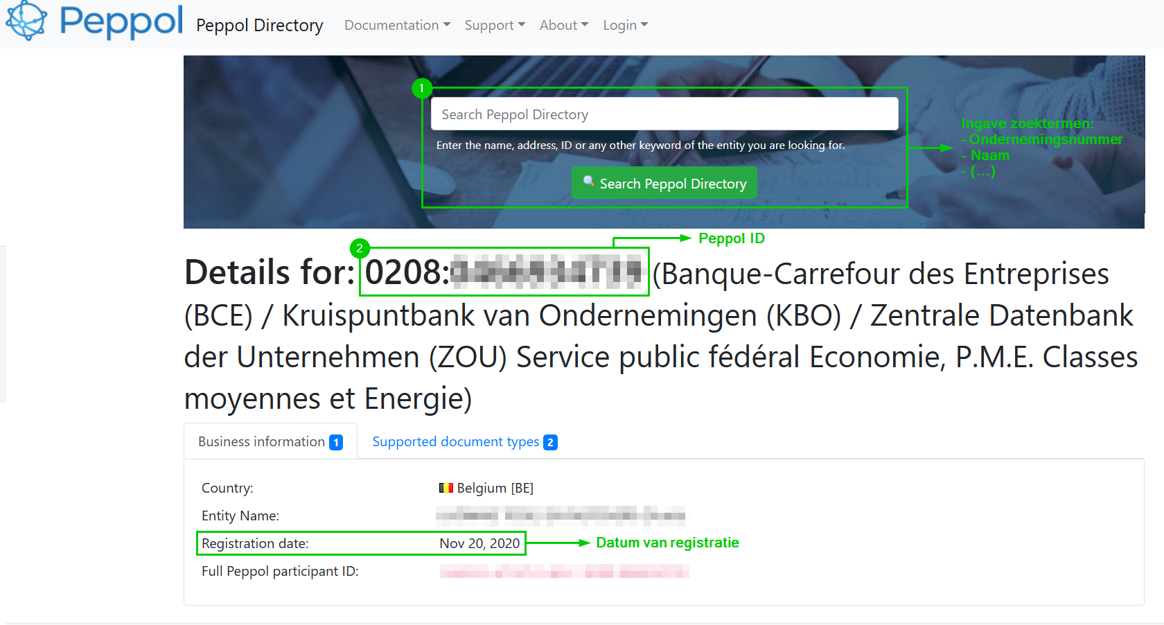 Je kan de Peppol ID eenvoudig terugvinden door de onderneming op te zoeken in de Peppol Directory.
