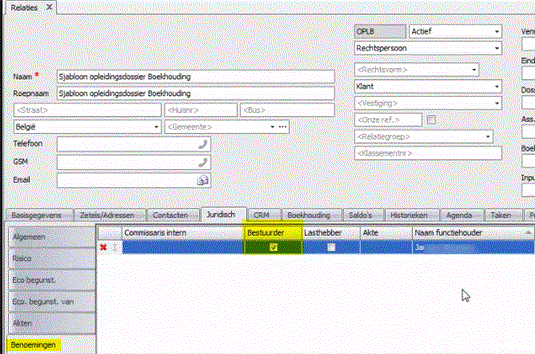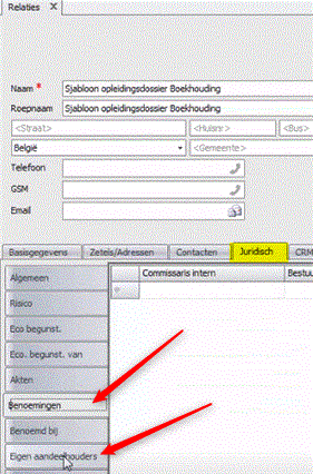 - Tab juridisch (op de tab benoemingen kunt u een bestuurder toevoegen of via de tab eigen aandeelhouders kunt u een aandeelhouder toevoegen)