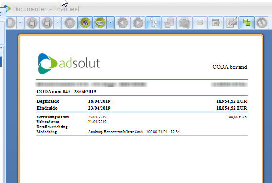 Wanneer een CODA-bestand verwerkt wordt in Adsolut waar geen PDF voor bestaat dan genereert Adsolut een PDF die in het DMS geplaatst wordt. Wanneer het CODA-bestand via één van de volgende functionaliteiten verwerkt wordt dan genereert Adsolut een PDF.
