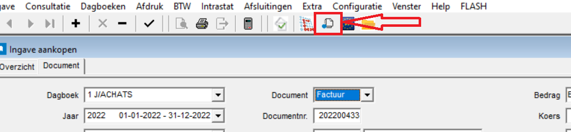 - UBL: via de visualisatieknop (zie onderstaande printscreen) in het menu "Dagboeken > Aankopen (of Verkopen) > Ingave Aankopen (of Verkopen)"