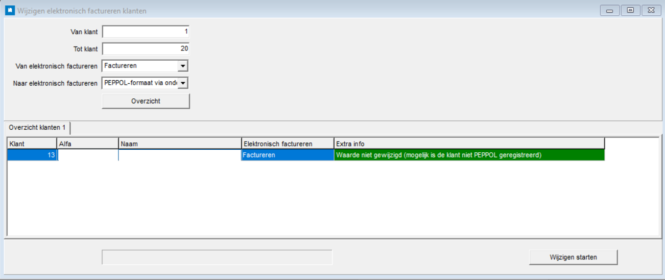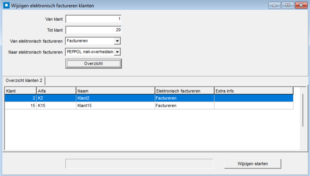 Onder het menu Extra vindt u het programma “Wijzigen elektronisch factureren klanten”. Met dit programma heeft u de mogelijkheid om de zendwijze van de facturen van meerdere klanten tegelijkertijd te wijzigen. Er wordt een controle voorzien. Indien de klant niet PEPPOL geregistreerd is, zal de waarde niet gewijzigd worden.
